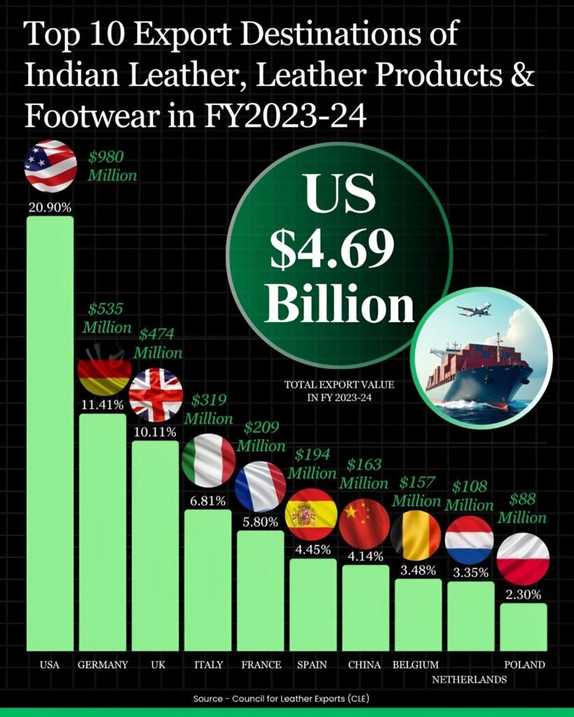 Germany is the largest EU buyer of Indian leather, leather products and footwear with imports of $535 million. Italy follows at $319 million. France, Spain, Belgium, Netherlands and Poland together add another $756 million in FY 2023-24.